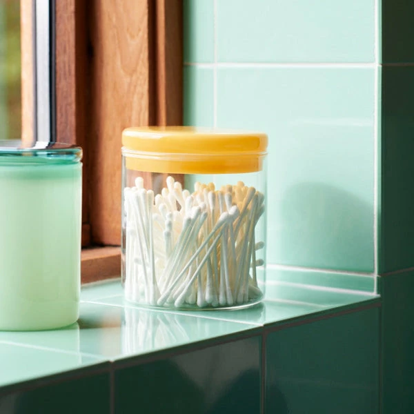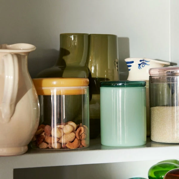 El bote de borosilicato de HAY es un recipiente multifuncional con cualidades tanto decorativas como funcionales. Fabricado en vidrio de borosilicato con una tapa de color contrastante, se puede usar para exhibición o almacenamiento en la mayoría de las habitaciones de la casa. La tapa está sellada con un anillo de silicona ajustado que la hace adecuada para almacenar alimentos, así como chucherías y otros objetos pequeños. Ø10 X 12 cm