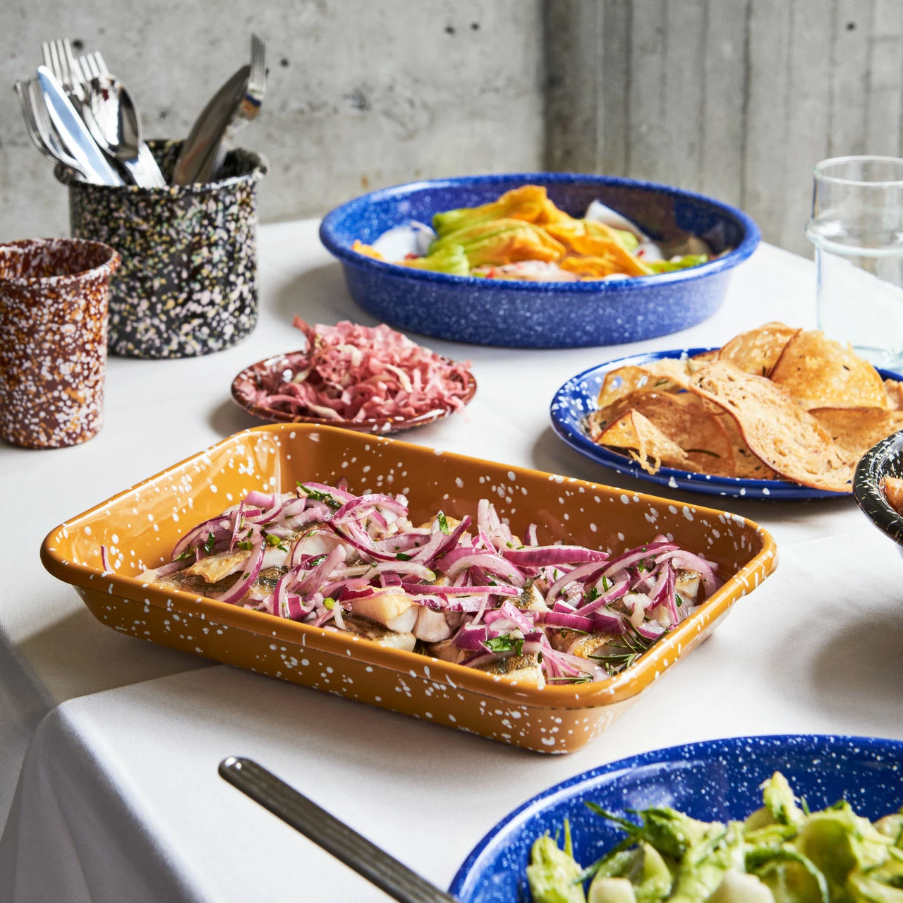 This new collection of enamel ware by HAY features both speckles and sprinkles. For the uninitiated sprinkles are multicoloured whereas speckles are mono colour!