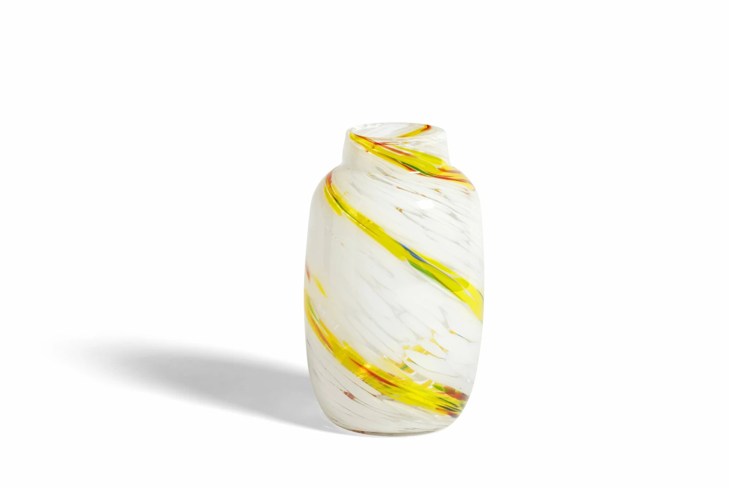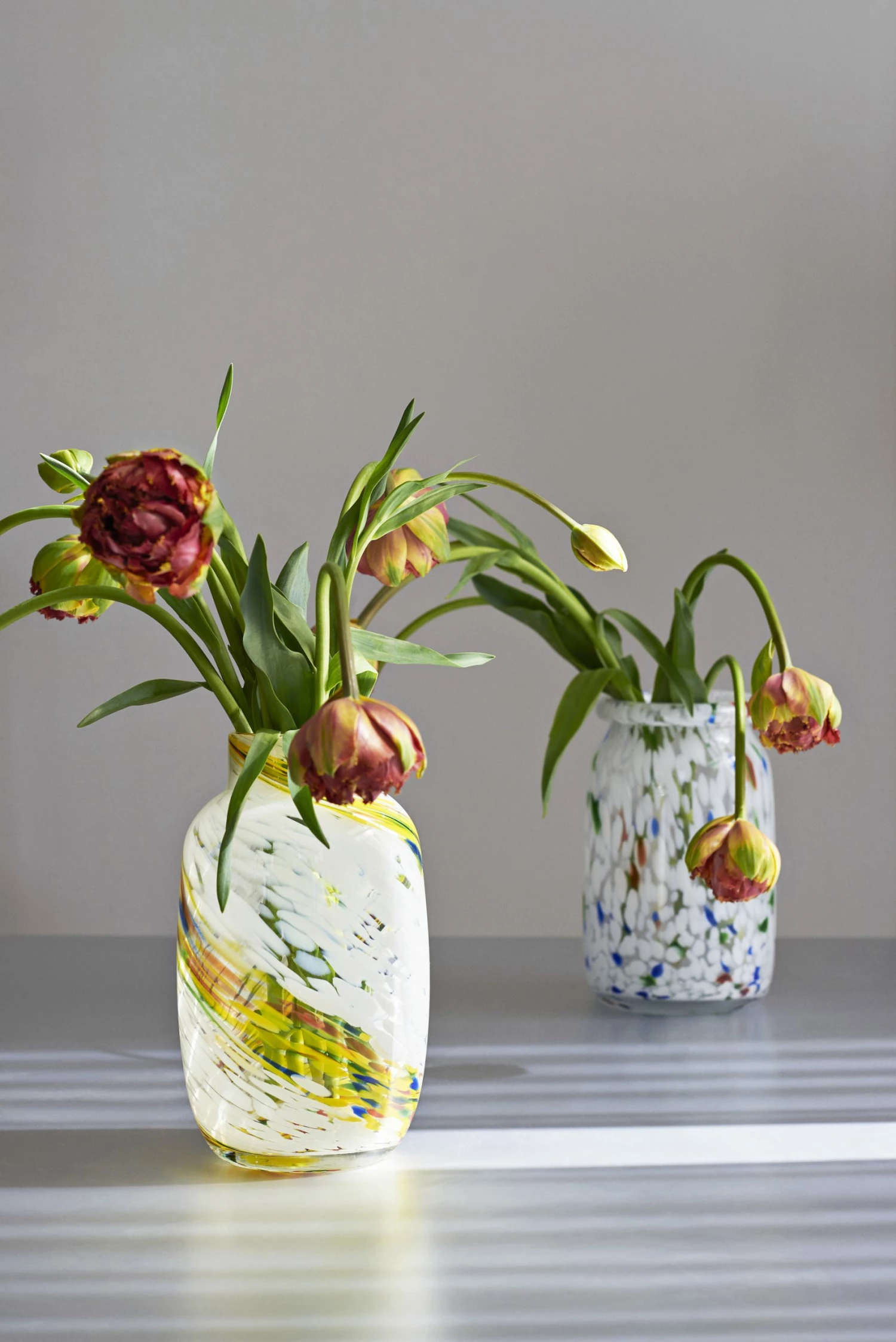 The Lemon Swirl Splash Vase is handmade using a special glassblowing technique that features a unique swirled pattern and round neck. The Splash vase can be used both for displaying flowers and as decorative objects.