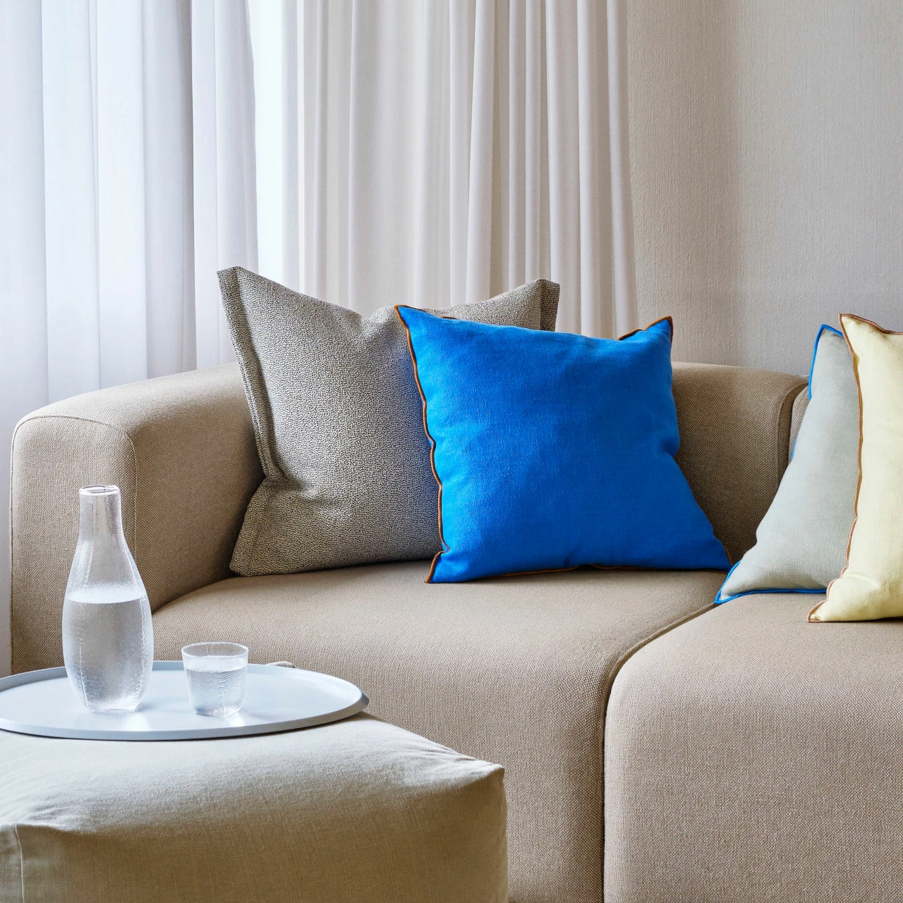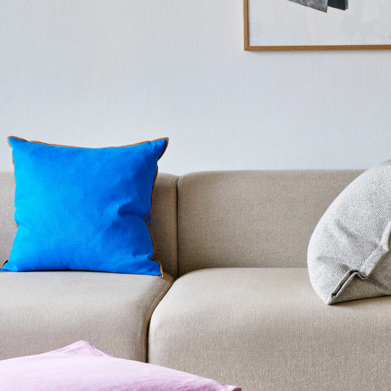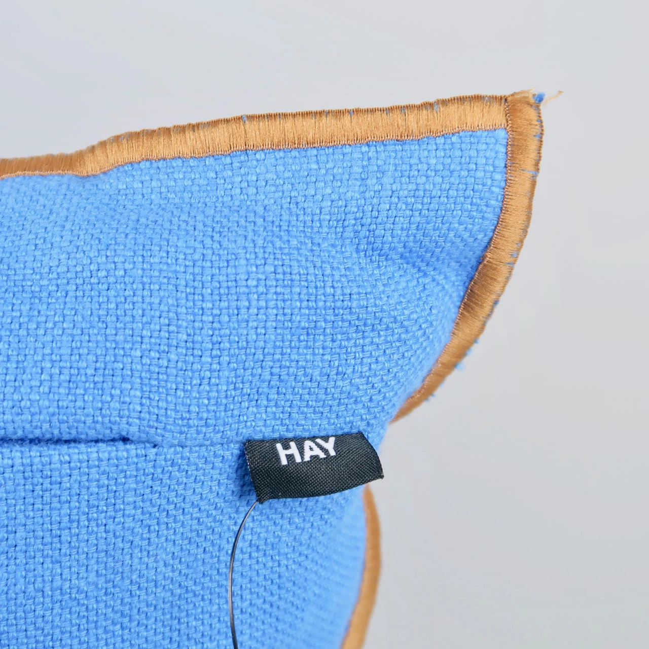 This cushion is made by HAY and the external fabric cover is a 75% linen, 25% cotton mix. It has a hidden zip closure on the reverse of the cushion with a colour matched zip and a small discrete HAY logo tag on the reverse as well.
