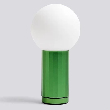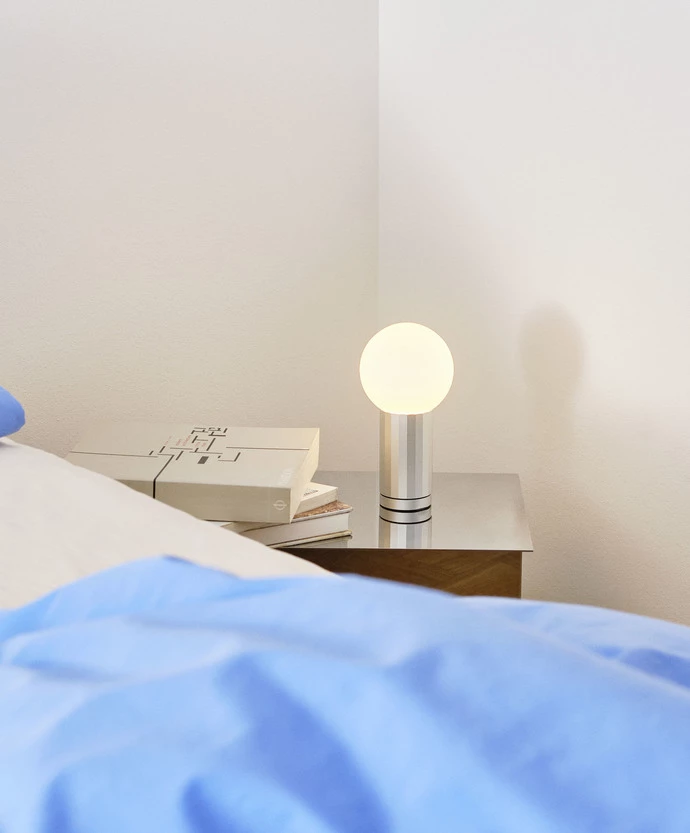A beautifully unified piece of design made from aluminium and opal glass. The base is a faceted cylinder that works as both the light switch and the stem that holds the spherical glass diffuser in place. Turning the base in a clockwise direction clicks the LED light on, with further rotation increasing the lumen output. This movement built into the design, allows the user to intuitively brighten or dim the light. The base comes in four anodised finishes: black, aluminium, orange or green. Turn On is a design made at human scale, effortlessly simple and pleasing to touch.