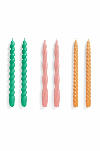 WHY WE LOVE: These candles offer a modern shape and colour palette to add decoration and light to any space Handmade in Italy the spiral candle set isn’t just for burning, the selection of complementary colours make them decorative elements in themselves. They come in twisted, conical, or spiral variants in a wide range of colours. Dimensions: Ø2.6 X H29 Materials: Paraffin Wax | Burning time 7hr Colours: Green, Dark Rose, Tangerine