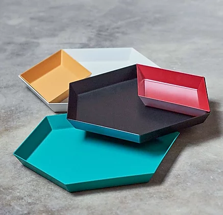Kaleido is a series of trays with a geometric shape, in different sizes and colors, which can be assembled as desired. It is a tray made of powder-coated steel, winner of the European Consumers Award 2014. Its versatility is the element that distinguishes it most, because it can be used as a tray to serve coffee, an aperitif or as a pocket tray, but it can be exhibited as a protagonist on a table top.