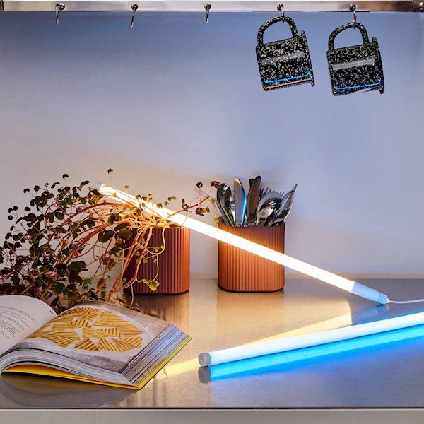 With its colorful glow, HAY’s Neon Tube LED Slim enables you to create an artistic atmosphere in any space by hanging it or leaving it standing upright against a wall. Use it separately or as a multiple light installation.