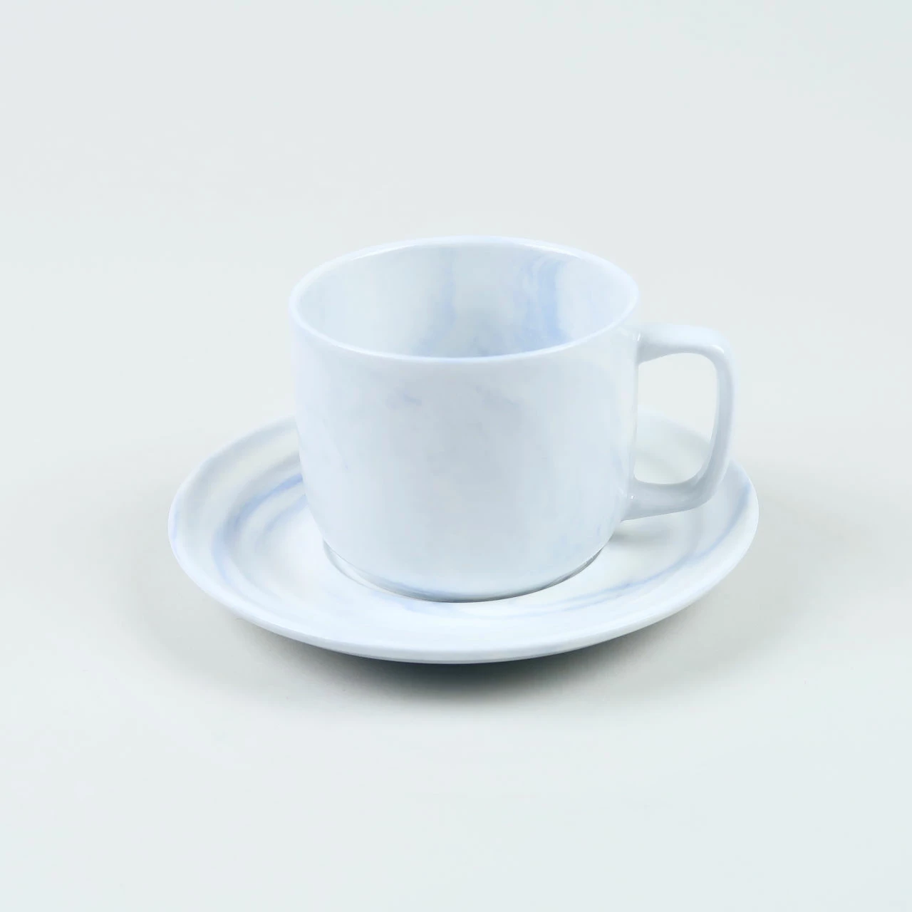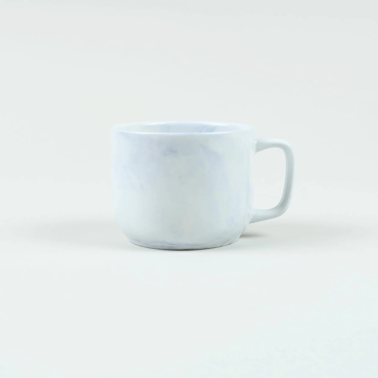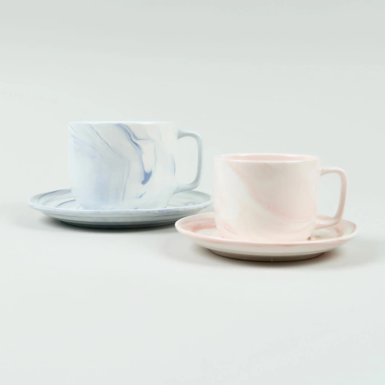 The pieces are dishwasher safe and are also available in pink. The marbled surface pattern differs from one piece to another.