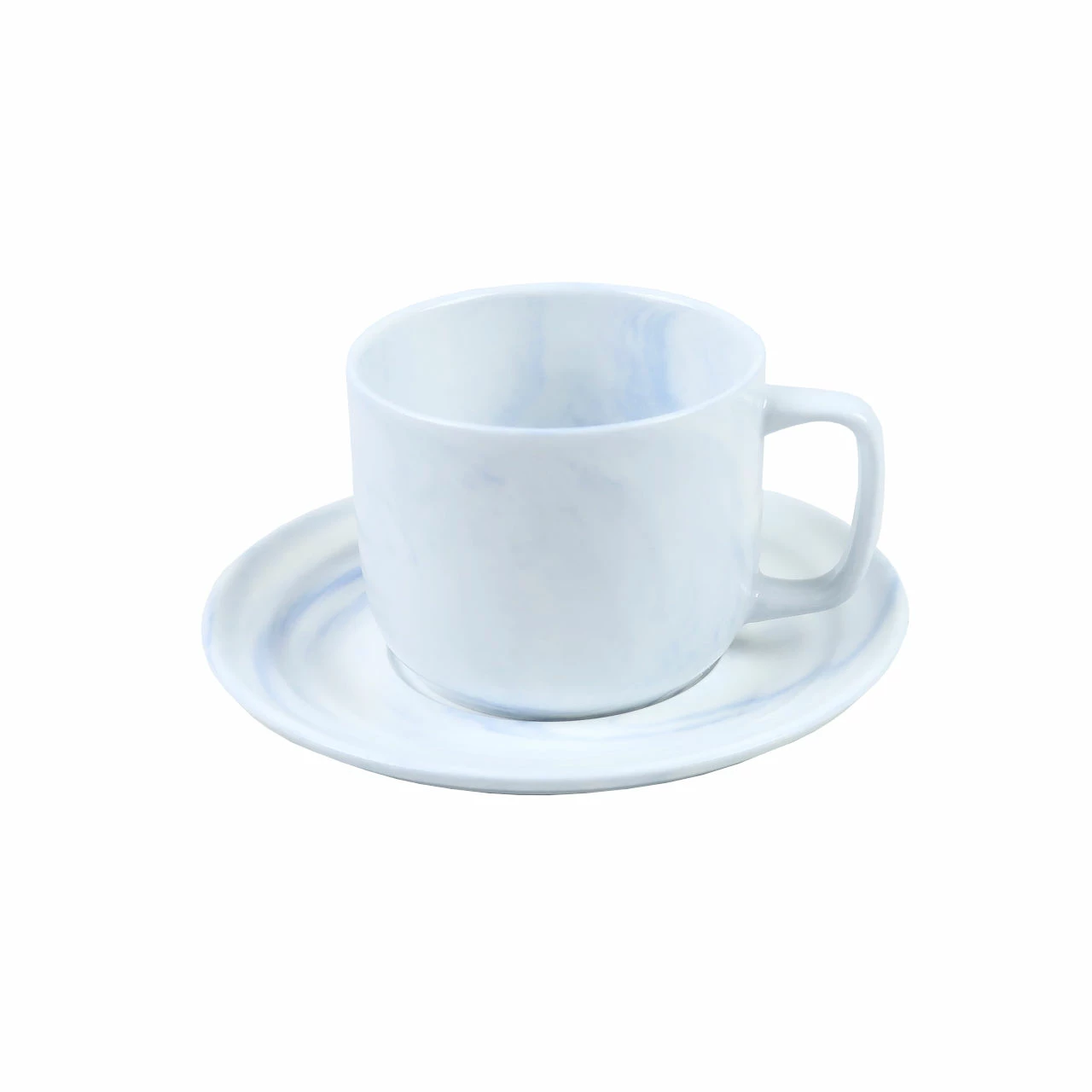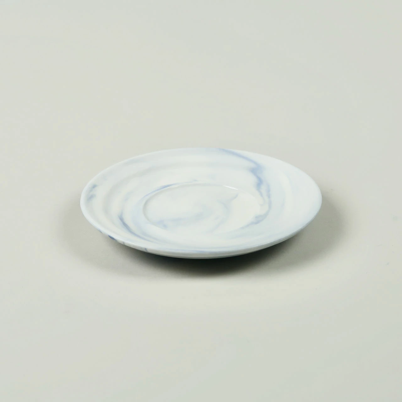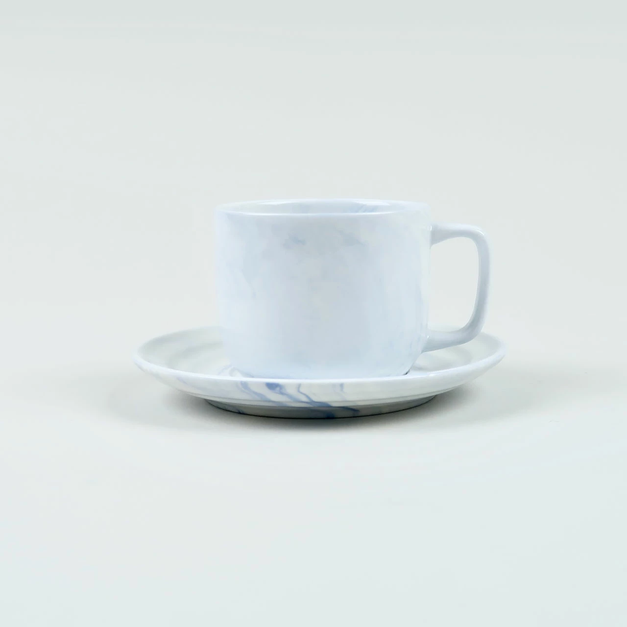 The pieces are dishwasher safe and are also available in pink. The marbled surface pattern differs from one piece to another.