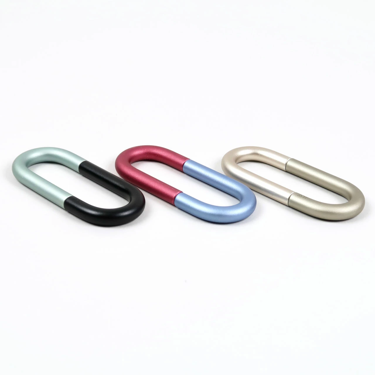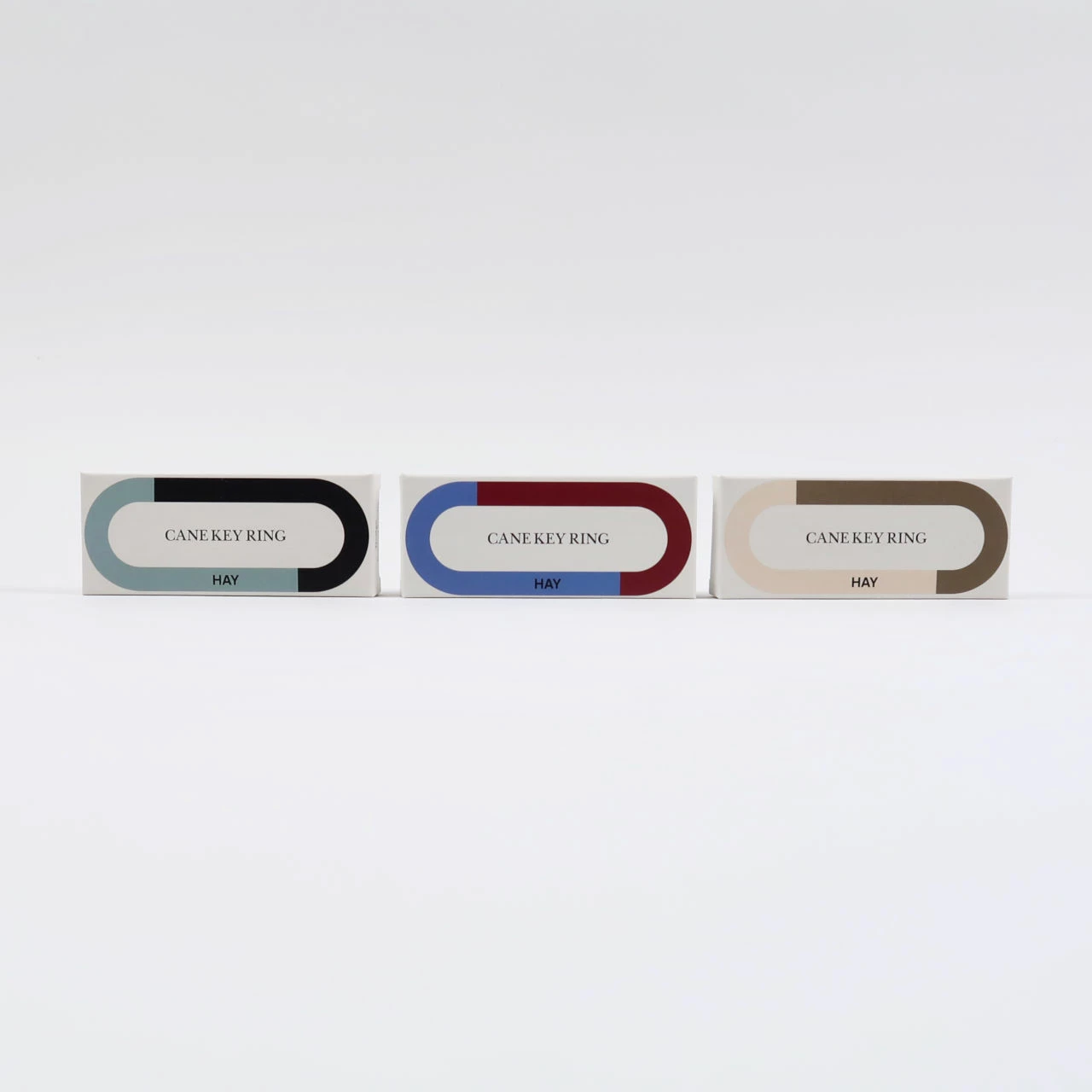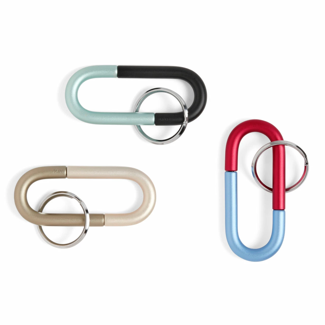 These loop form keyrings are made from aluminium by HAY and come in three different colour variations: black, olive green and red. Although the colours are listed like this each keyring is actually bi-colour.
