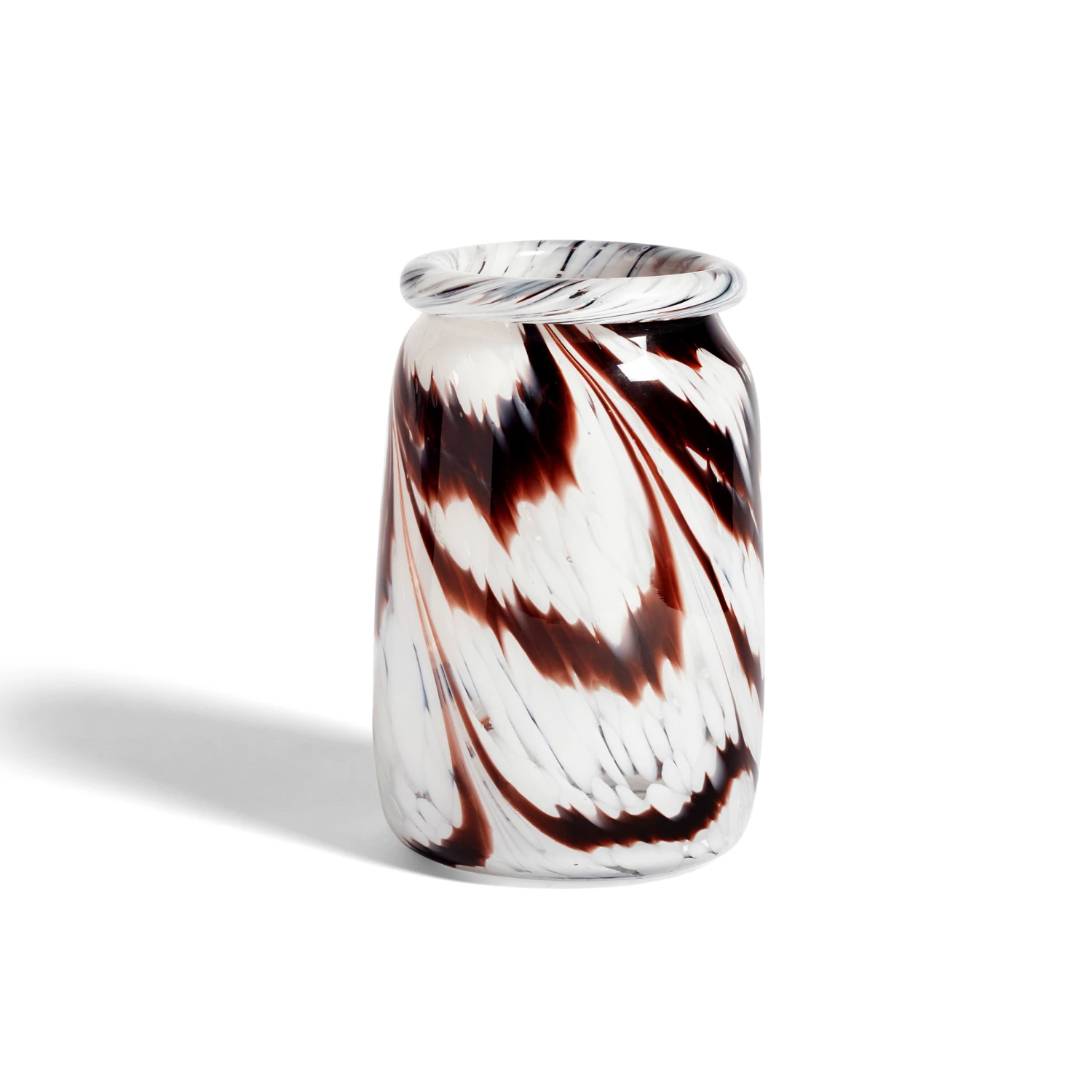 The Coffee Splash Vase is handmade using a special glassblowing technique that involves multiple layers of coloured glass dots, and features a unique swirled pattern and round neck. The Splash vase can be used both for displaying flowers and as decorative objects.