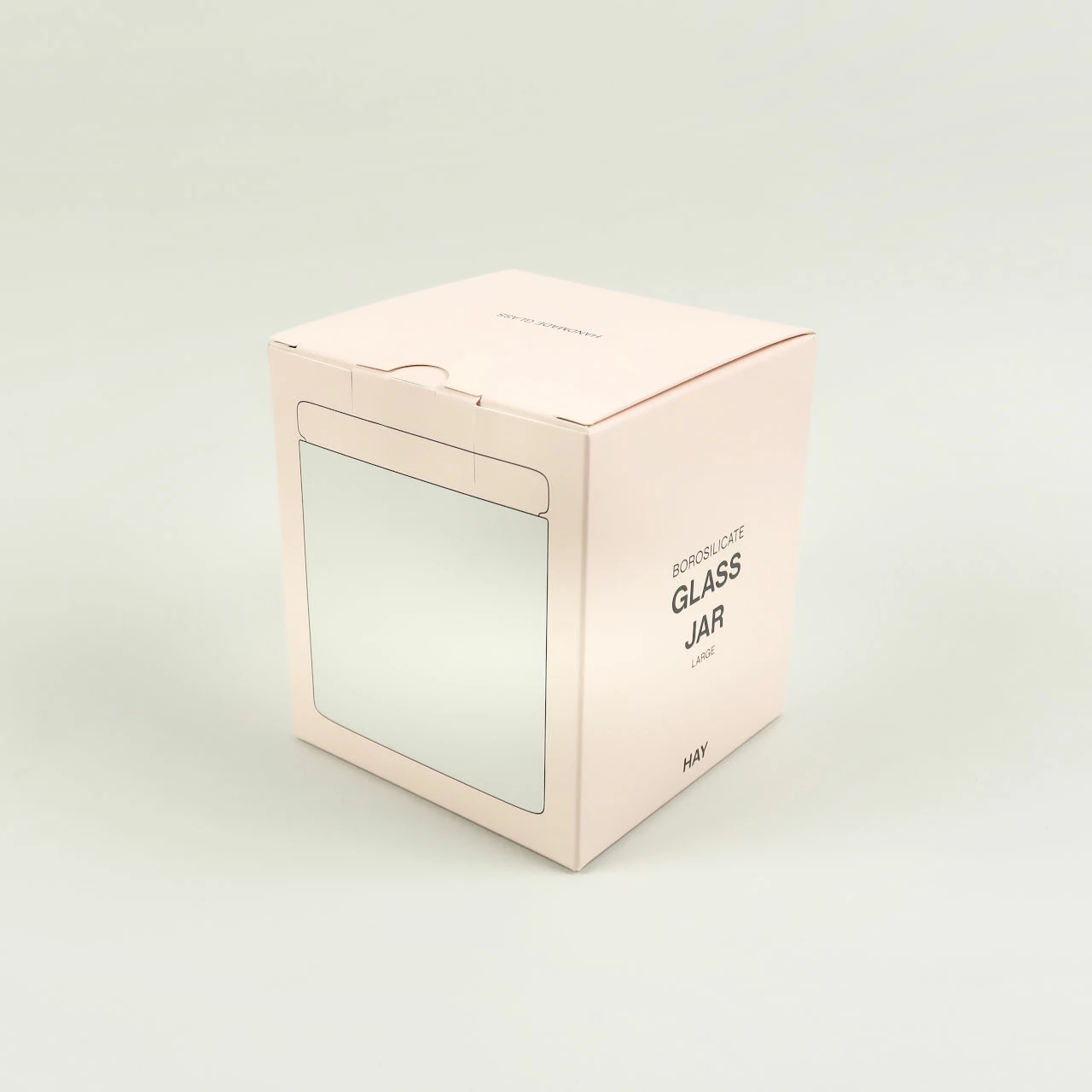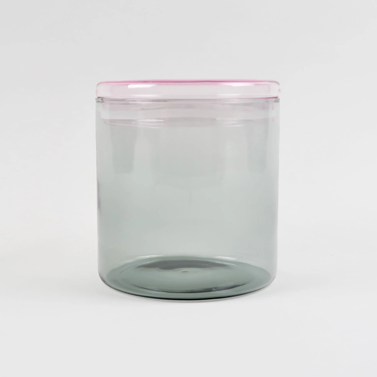This jar is made from borosilicate glass. The body of the jar is a subtle grey colour while the lid is made from pink borosilicate glass. A useful storage jar in the kitchen or the bathroom. You could use it for coffee beans or tea bags in the former and cotton wool or buds in the latter.