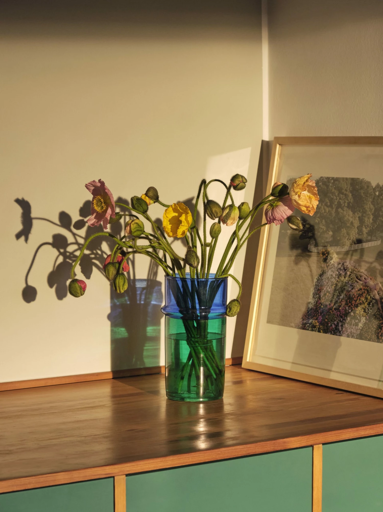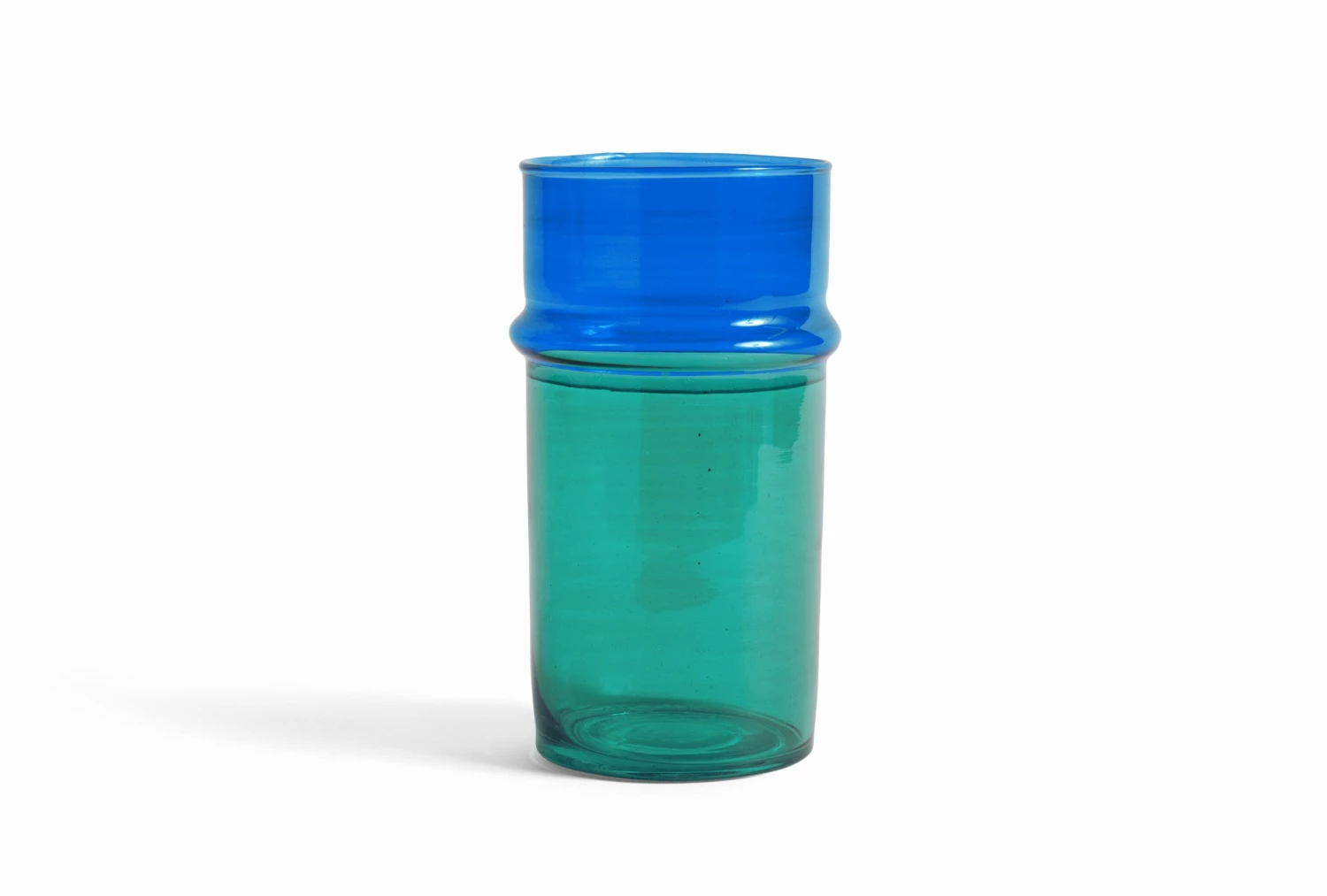 Hand-blown in Morocco, these painted glass vases are an easy way to add a pop of colour to a room. Crafted from recycled glass, they are available in two different sizes in a variety of monocoloured or colour-blocked designs.