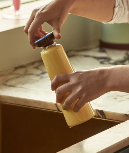 Contrasting colours make for a playful expression with George Sowden’s bottle series. Crafted in stainless steel with a plastic screw lid.