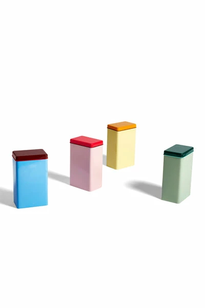 WHY WE LOVE: Brightly coloured and fun storage solution for the kitchen Designed in collaboration with Milan-based artist, George Sowden, the Sowden Coffee Tin is a colourful tinplate container with an airtight lid that is suitable for coffee and other dry foods Dimensions: W 12 D 8 H 20 cm Materials: Stainless Steel