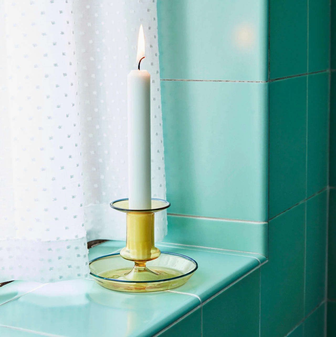 The candlestick comes in three different colour variations – yellow, as here and also amber and pink. The translucent glass would look great against a white tablecloth on a dining table and also lets the candlelight shine through.