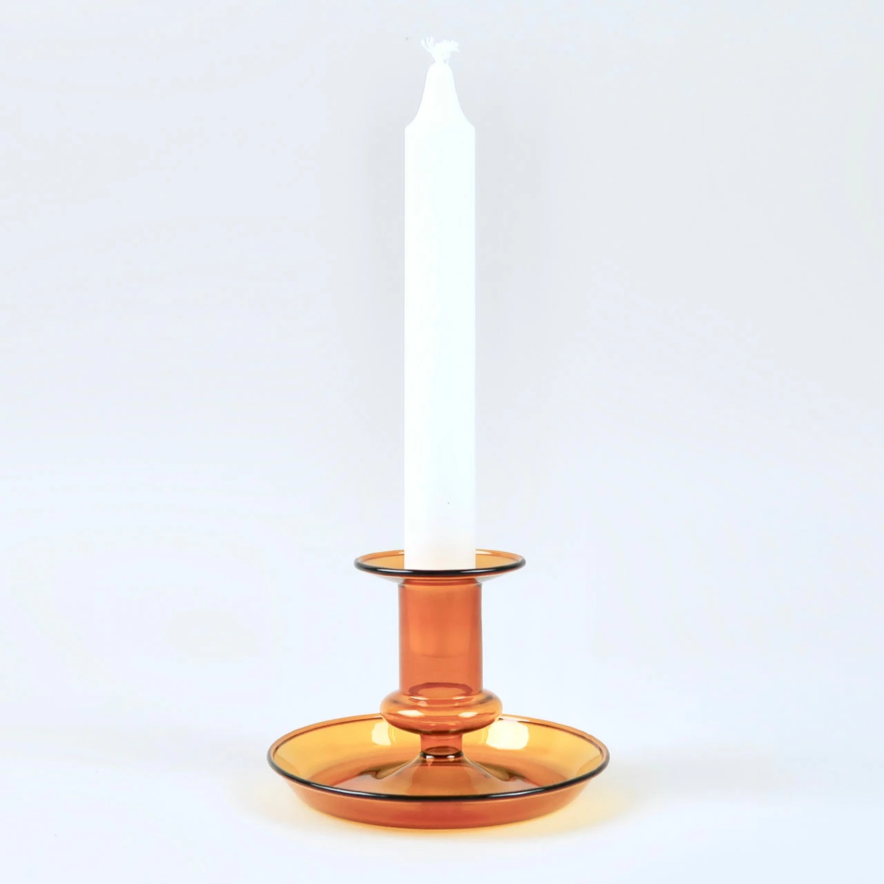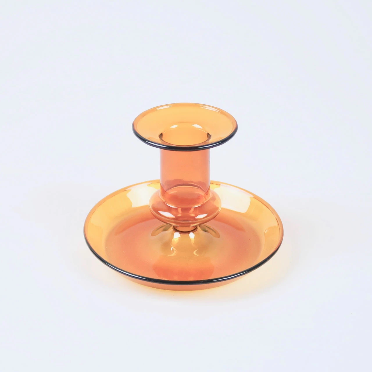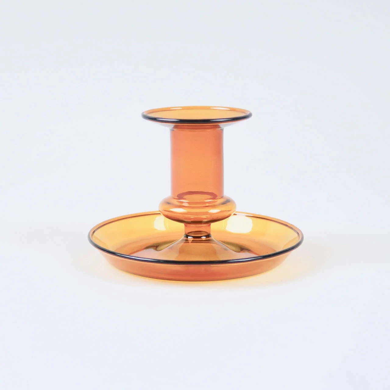 The candlestick comes in three different colour variations – amber, as here and also pink and yellow. The translucent glass would look great against a white tablecloth on a dining table and also lets the candlelight shine through.