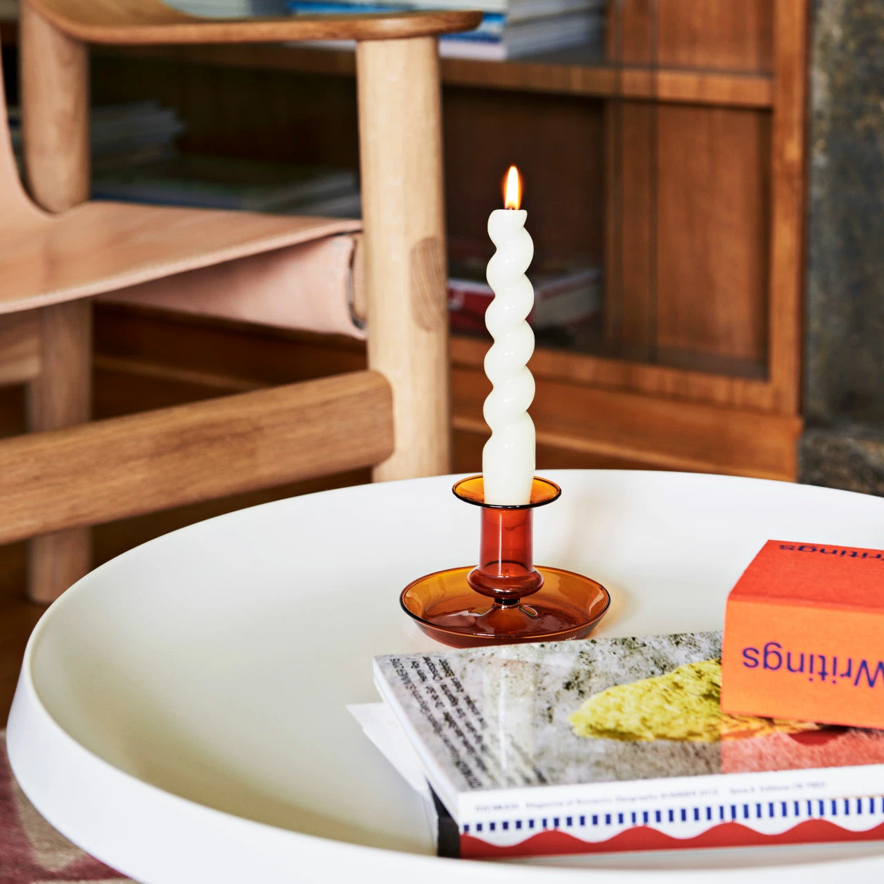 This glass candlestick is made by the Danish design brand HAY. It features a tray around the base of the candle holder which enables both the capture of any wax that drips from the candle and also provides a platform from which the candlestick can be gripped and moved from place to place.