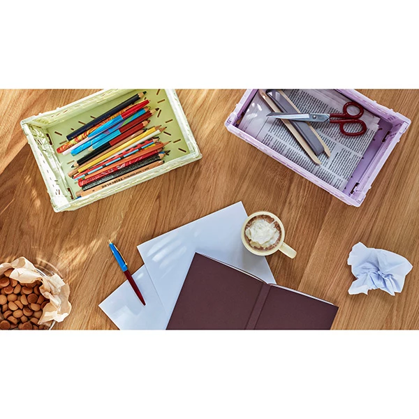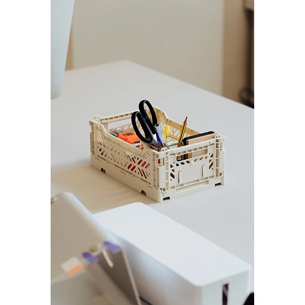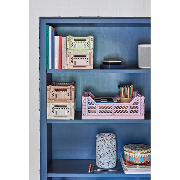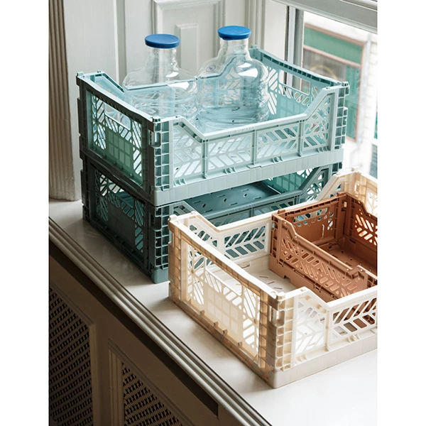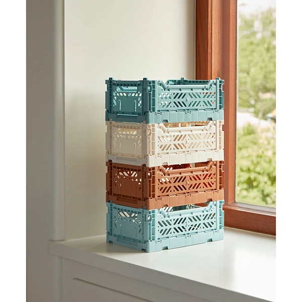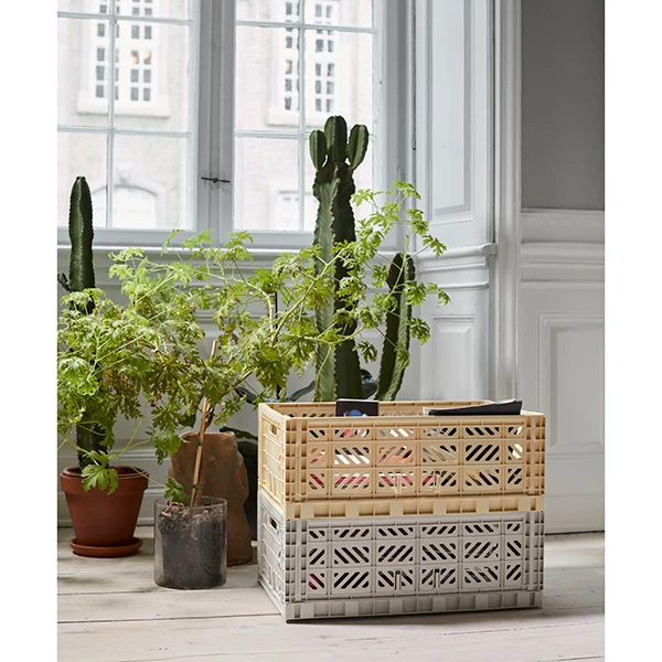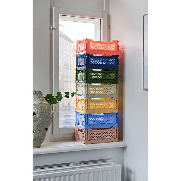 Multifunctional plastic crate from Hay. It has a ventilated and stackable design, perfect for keeping everything you need at hand. Use them in your bathroom, closet, office or kitchen. These crates will help you organize your home.