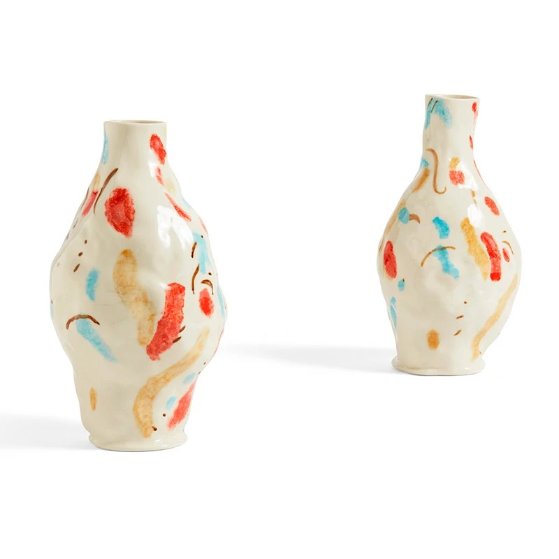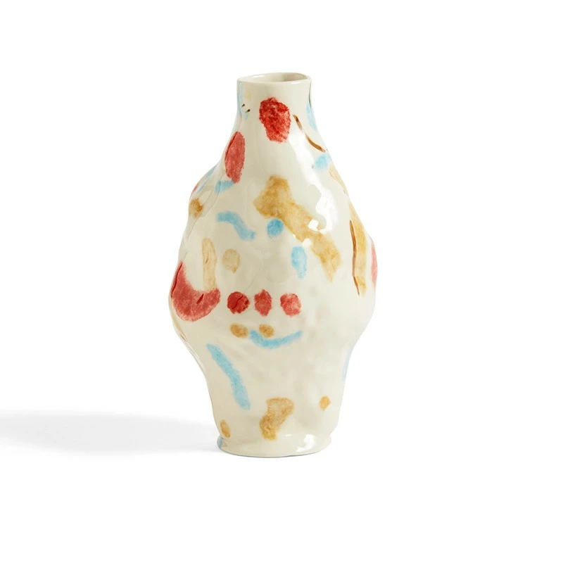 The vase with the termination Miro by Jessica Hans, is designed with its irregular surface, becoming a point of attraction thanks to the expressionist color splashes.