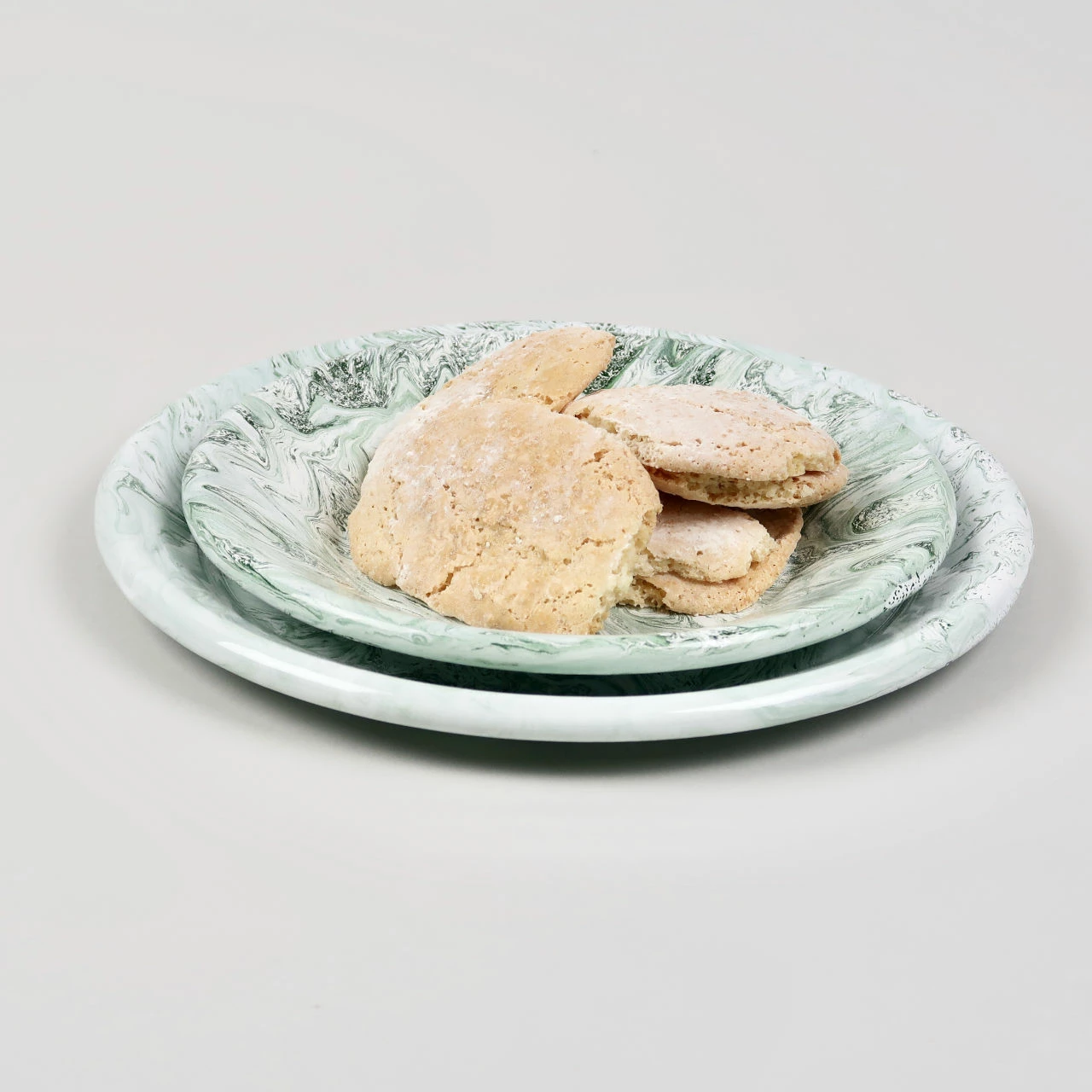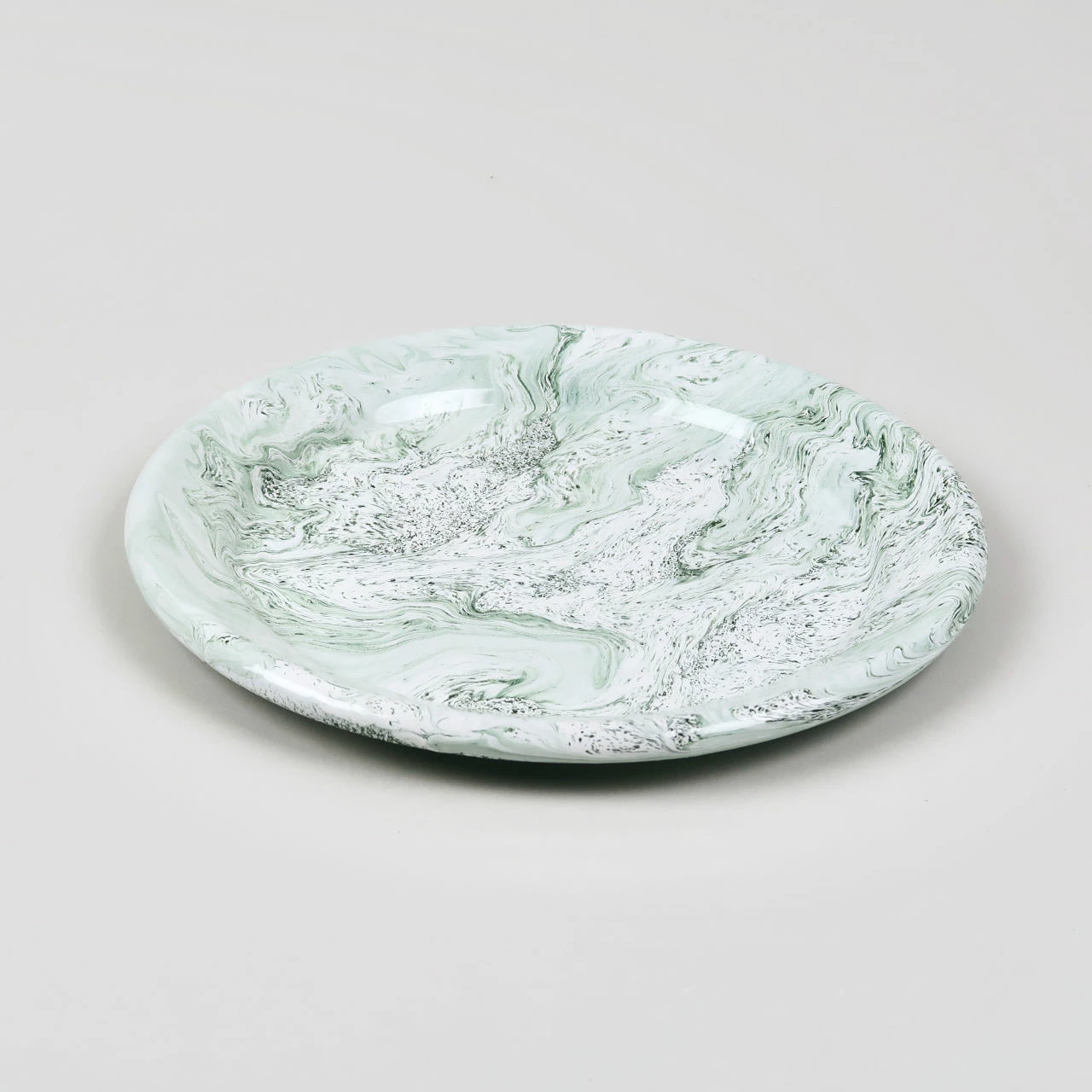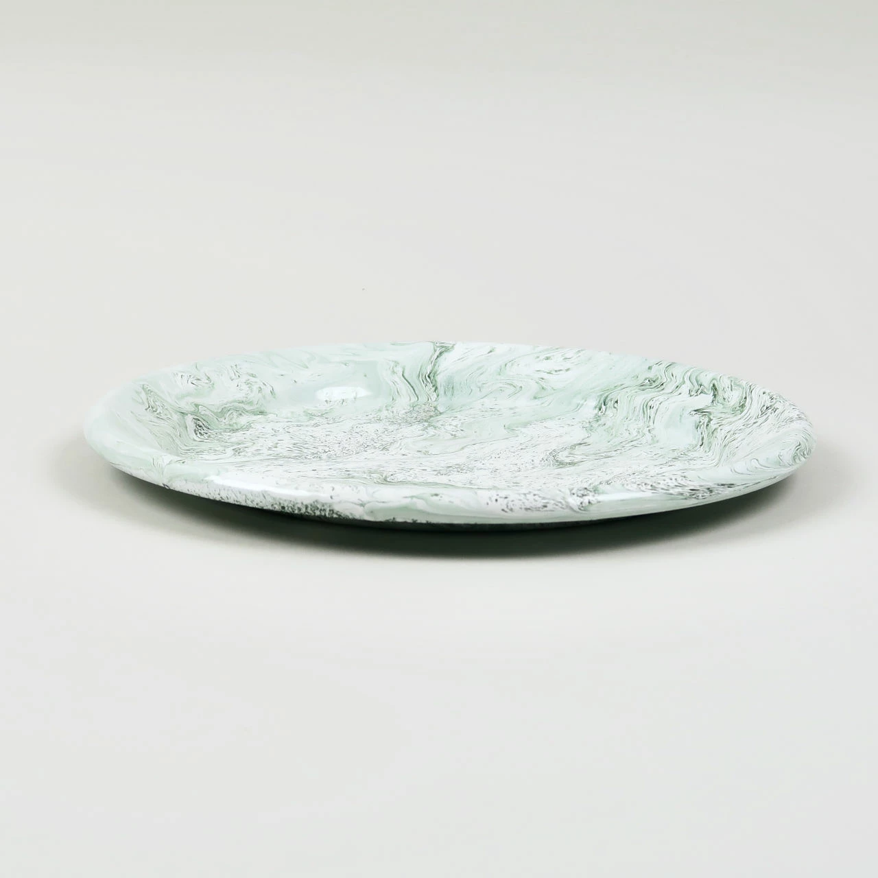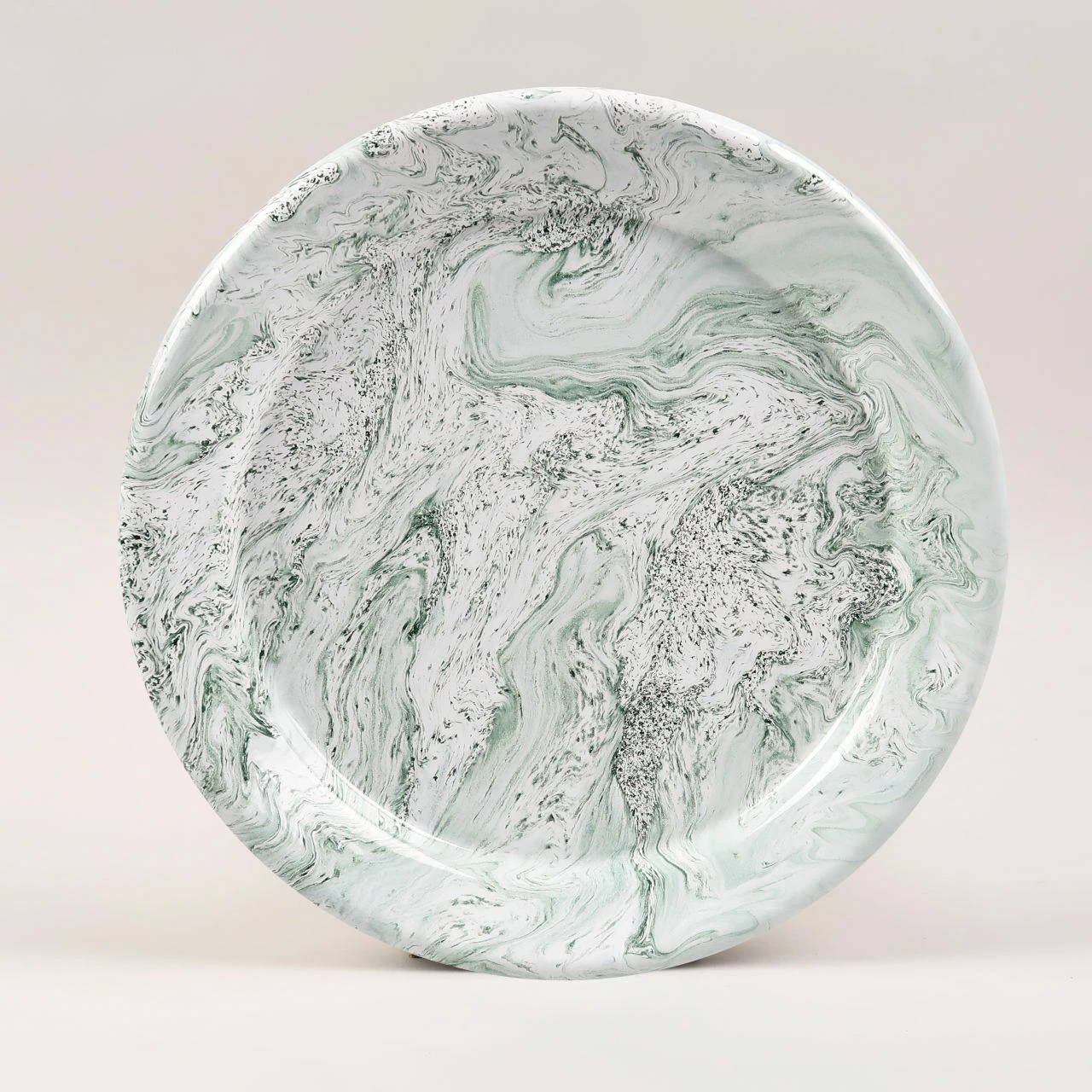The plate is made from enamelled steel and has a marbled green and white pattern to the enamel. As the marbled enamel is all applied randomly no two plates are going to look exactly the same. All enamel is slightly more fragile than it looks and if dropped or knocked excessively the enamel may well chip. The plate will remain intact but the enamel will flake where the impact has occurred.
