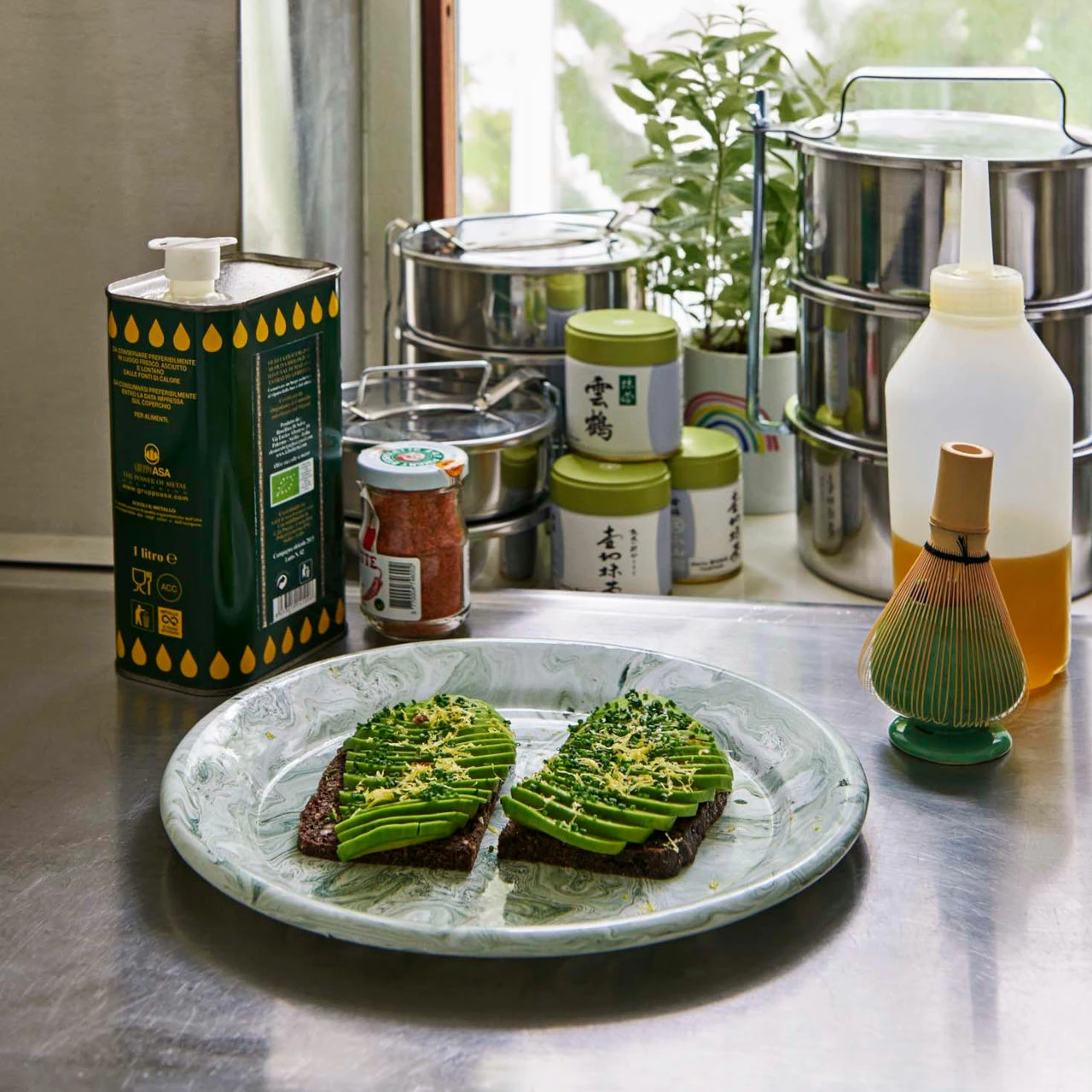 HAY have several other tableware pieces in this same green enamel finish: a smaller lunch plate, an oval serving plate and a salad bowl. All of them would look great alongside one another and equally would look great mixed with a white bone china piece of tableware and a linen napkin.
