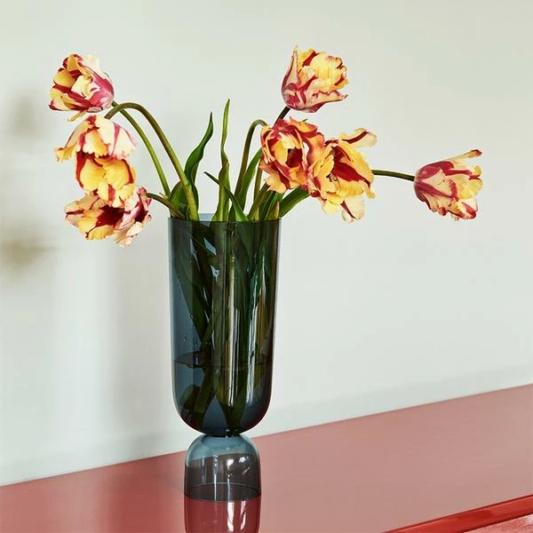 Deze Bottoms up vaas uit de collectie van het Deense merk HAY is een ontwerp door Ingrid Aspen. De hals van de vaas lijkt te balanceren op de koepelvormige standaard en is gemaakt uit tweekleurig getint glas. Gebruik de vaas decoratief of voor een boeket wilde bloemen. Een echte blikvanger voor in je interieur. Deze Bottoms Up vaas is beschikbaar in twee formaten en verschillende kleuren. Materiaal: glas Afmetingen: Ø12 x H29,5 cm Kleur: blauw Onderhoud: schoonmaken met lauw water