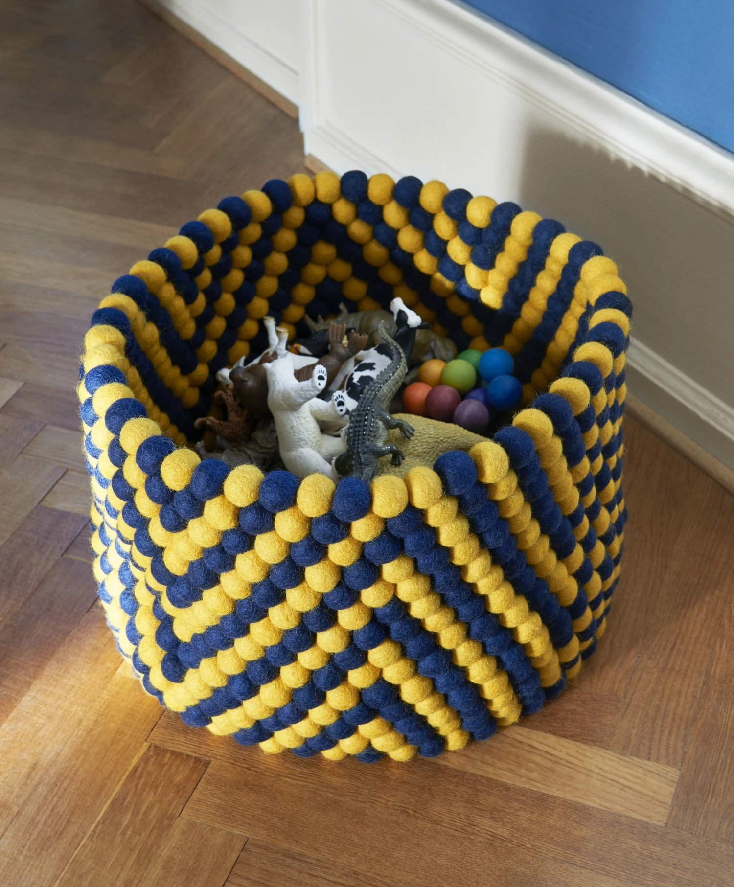 The Yellow Chevron Bead Basket is handmade in Nepal using traditional craft methods. Bead Basket is made from hundreds of felt balls that are individually hand rolled into colourful graphic patterns, creating a distinctive and decorative storage solution for most rooms in the home. Please note that as all the baskets are made by hand, they may vary slightly in size. 100% wool.