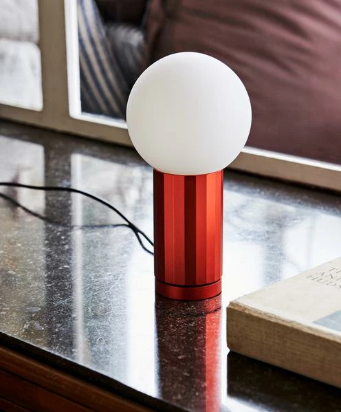 Una pieza de diseño bellamente unificada hecha de aluminio y vidrio opal. La base es un cilindro que funciona como el interruptor de luz y. Al girar la base en el sentido de las agujas del reloj, se enciende la luz LED, y una mayor rotación aumenta la salida del lumen. Este movimiento integrado en el diseño permite al usuario iluminar o atenuar la luz de forma intuitiva. Diseñado por Joel Hoff para HAY. 19.5 x 10 cm.