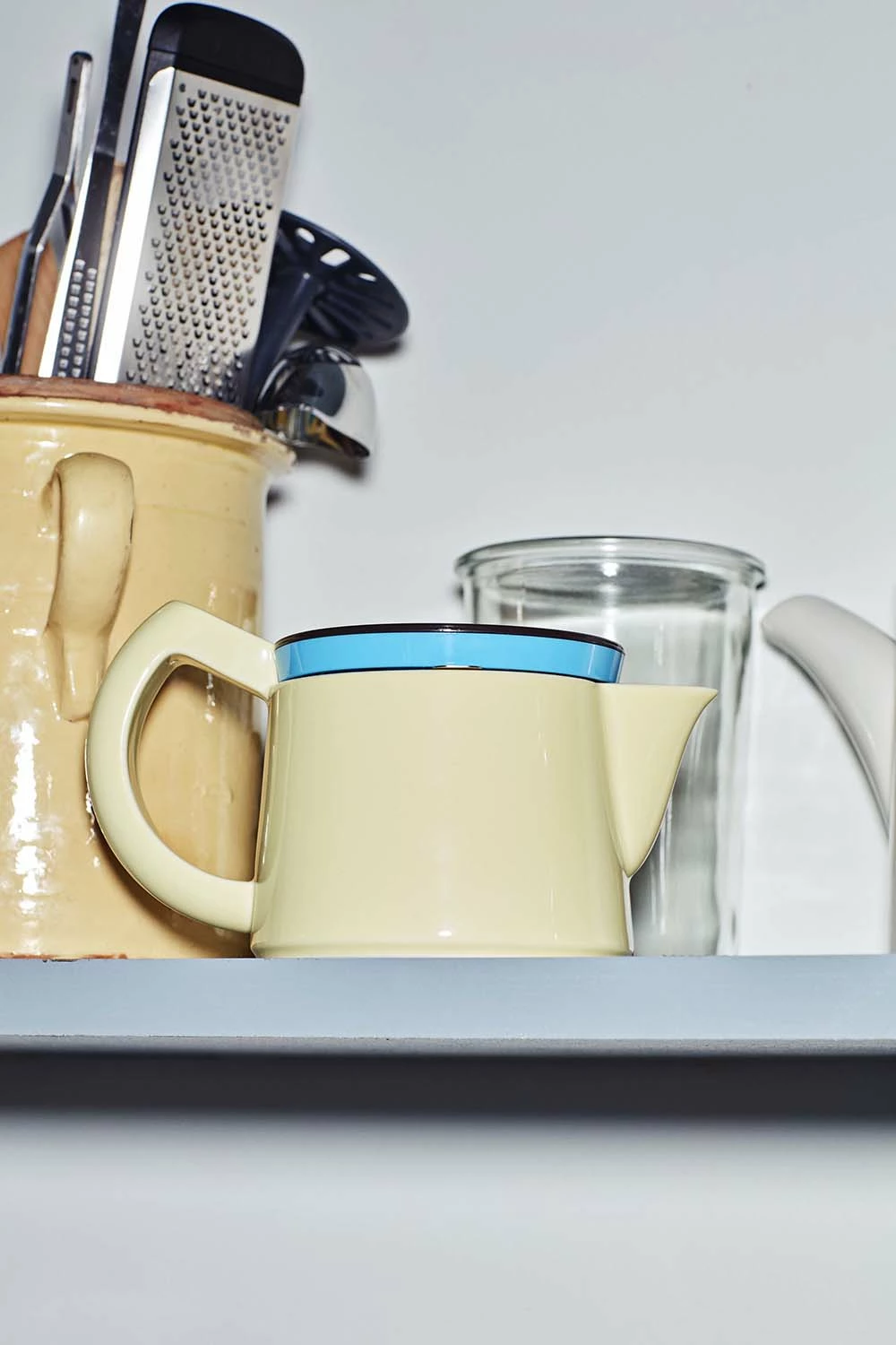 Coffee is a design by George Sowden for HAY. Comprises a porcelain exterior with innovative SoftBrew™ brewing device that infuses the coffee through a centrally located micro-thin stainless steel filter to enhance the flavour. Plastic lid. Capacity 0.45 L.