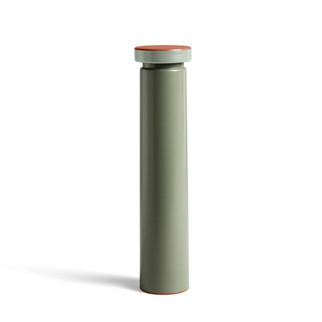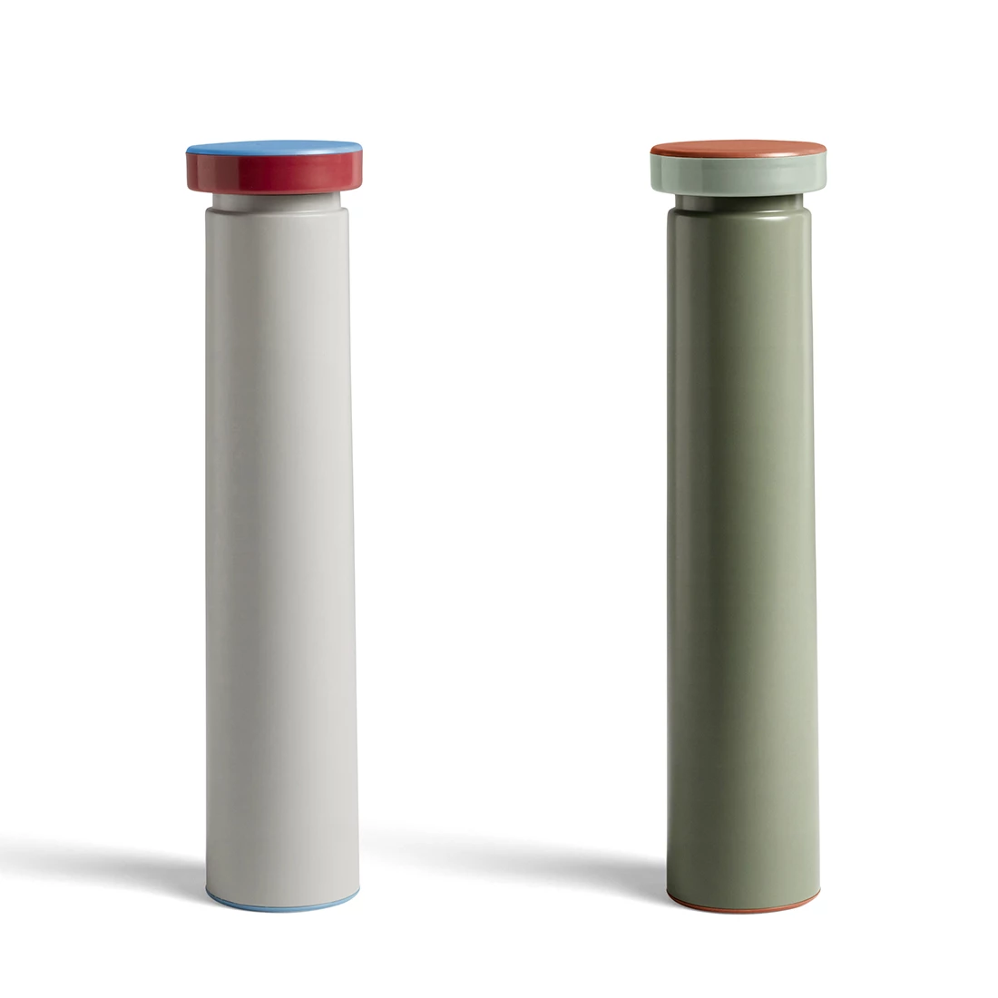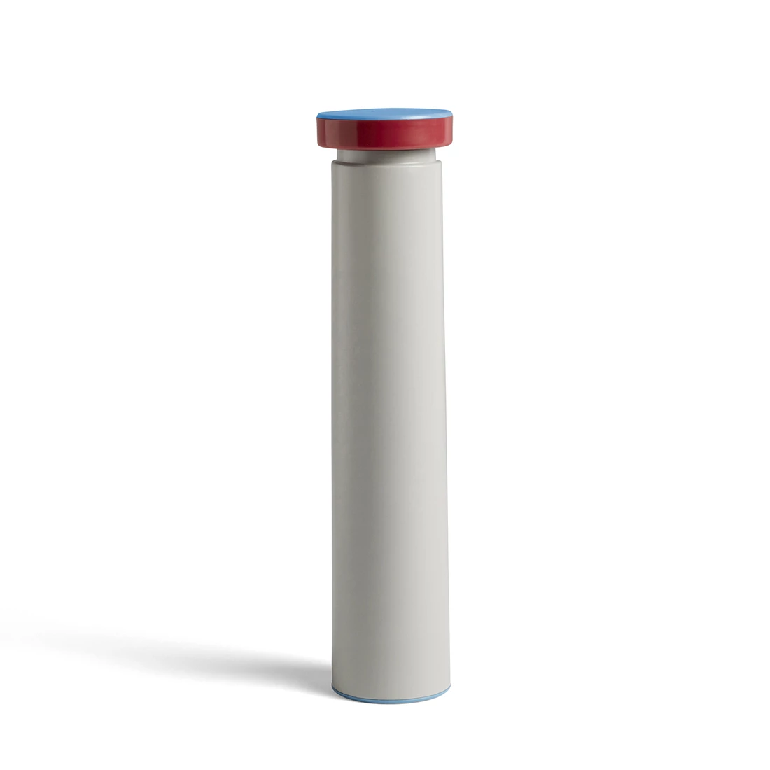 Pepper mills in the colors of the Sowden collection for HAY. Made of stainless steel with polypropylene lid. They feature a ceramic grinder that enables you to adjust the size and coarseness of the salt or pepper grain.