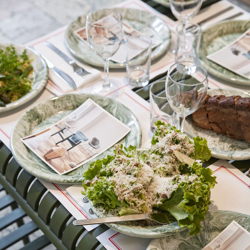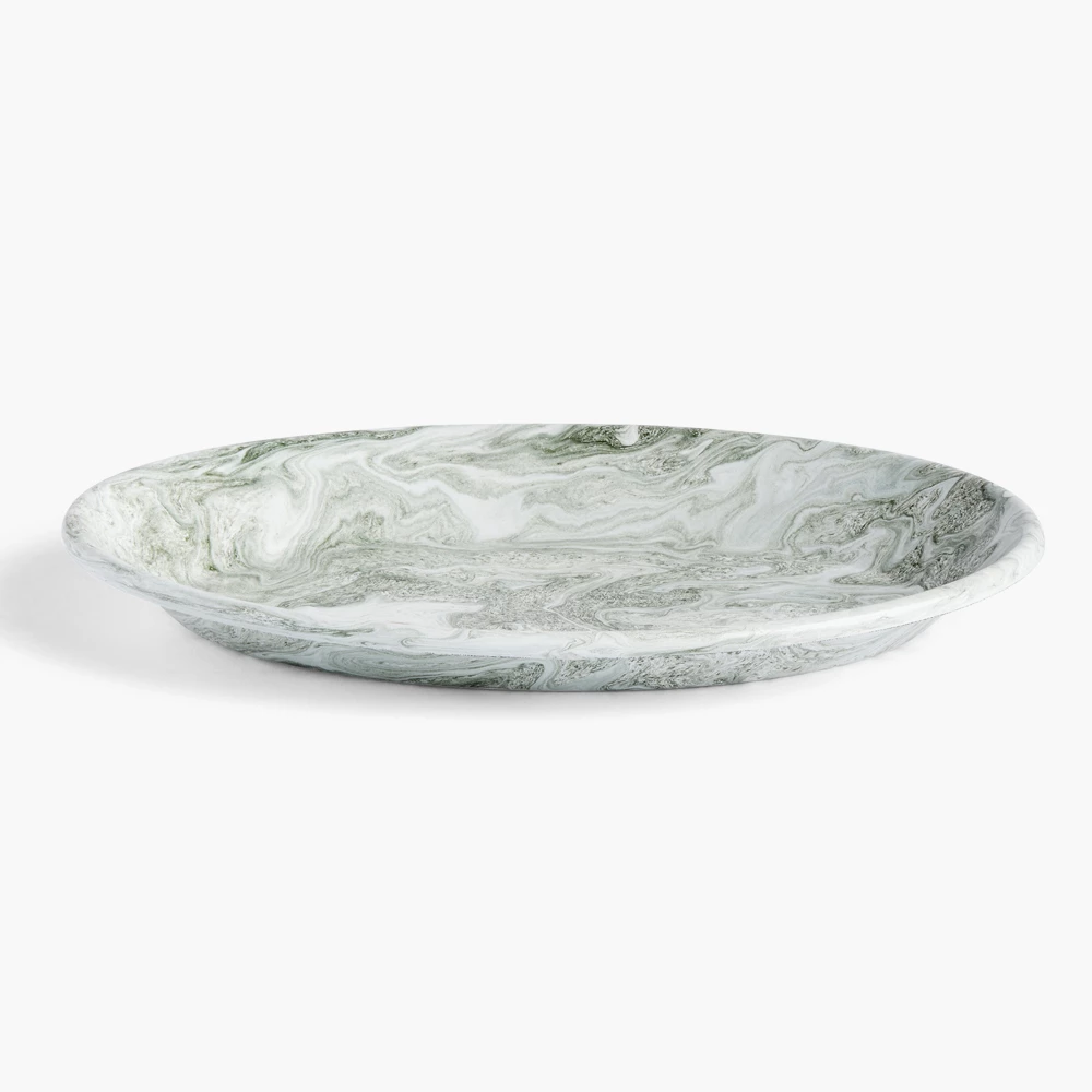 The beautiful marbled Soft Ice tableware collection from HAY is made from enameled steel.